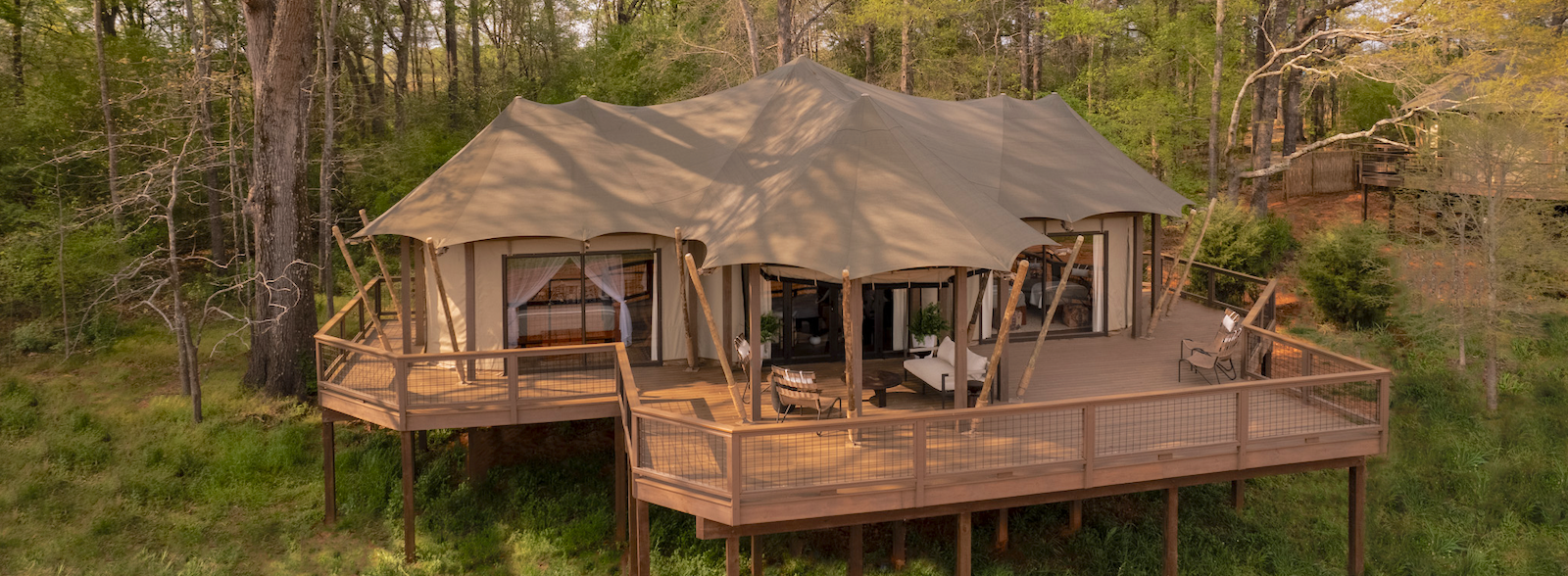 The interior of your lodging unit is a haven of comfort, with luxurious furnishings, plush bedding, and modern amenities ensuring a truly indulgent stay. Each unit is climate-controlled and has wood floors, a spacious living and dining room, and a kitchenette with a refrigerator, microwave, and coffee station. The primary bedroom offers a king-size canopy bed with a sitting area and floor-to-ceiling picture windows, while the secondary bedroom offers two twin beds that can be combined into a king, a sitting area, and floor-to-ceiling picture windows. Both bedrooms offer direct views of our animals grazing in the open savanna. Each tent lodge has a full bathroom with both a soaker tub and tiled shower, and private outdoor spaces to relax and unwind. Experience the thrill of being immersed in the wilderness while still enjoying the luxuries of a refined retreat.