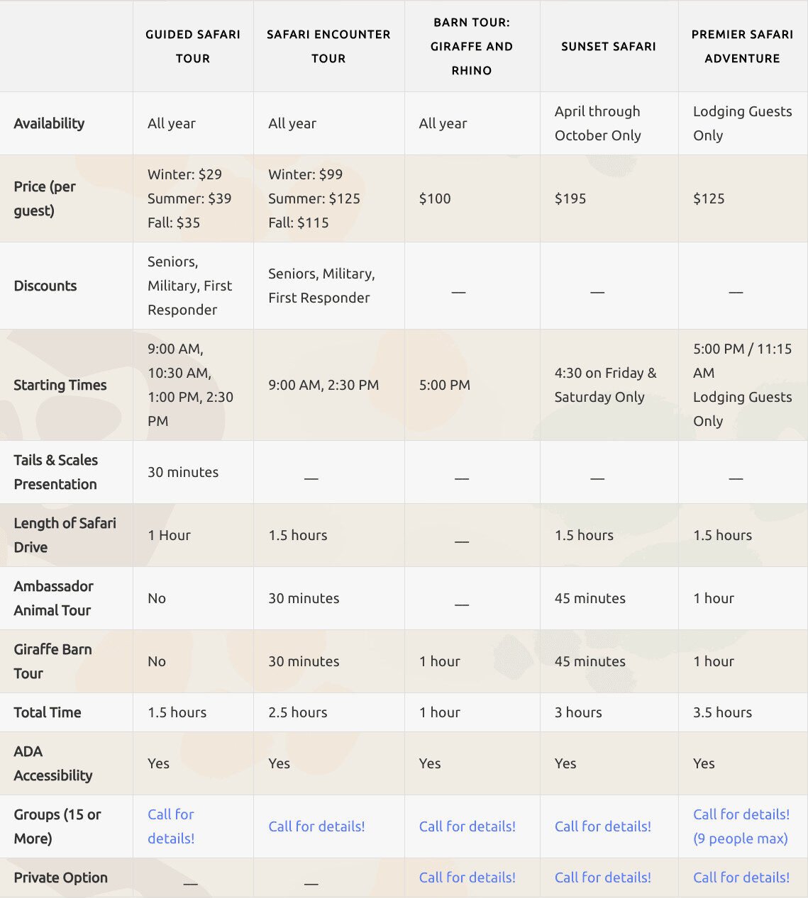 Guided Safari Tour | Safari Encounter Tour | Barn Tour: Giraffe and Rhino | Sunset Safari | Premier Safari Adventure | |